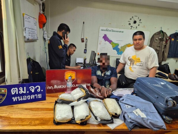 วันนี้ (1 เม.ย.69) เวลา 05.00 น. งานสืบสวน ตม.จว.หนองคาย ออกตรวจท้องที่รับผิดชอบ เมื่อผ่านศาลาข้างทางบริเวณบ้านดงเวร พบชายผิวสีนั่งอยู่และแสดงท่าทางมีพิรุธ จึงได้ขอทำการตรวจสอบ พบว่า ต่างด้าวผิวสี ชื่อ Mr.Desmond สัญชาติไนจีเรีย ในตัวพบเป้สะพายหลัง และกระเป๋าเดินทางแบบลากอีก 1 ใบ มียาเสพติดให้โทษประเภทที่ 1 (ยาไอซ์) จำนวนกว่า 6 กิโลกรัมในกระเป๋าเดินทางแบบลากของผู้ต้องหา จึงทำการยึดของกลางและจับกุมตัวผู้ต้องหา และจะทำการขยายผลหาผู้ร่วมขบวนการคนอื่น ๆ ต่อไป