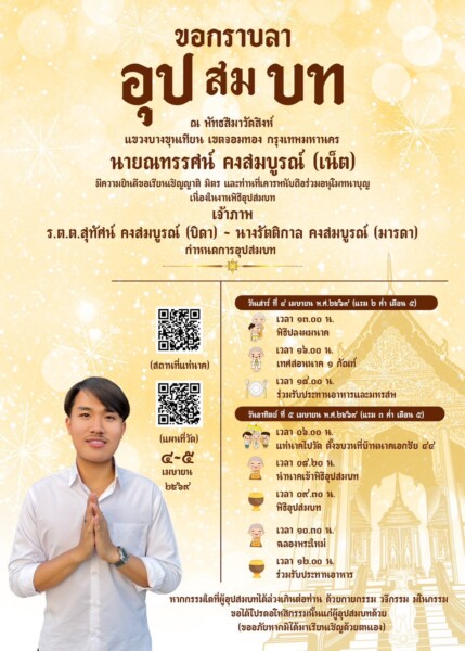 จึงขอกราบเรียนเชิญญาติสนิท มิตรสหาย และท่านที่เคารพนับถือทุกท่าน ร่วมอนุโมทนาบุญในพิธีอุปสมบทครั้งนี้ โดยมี ร.ต.ต.สุทัศน์ คงสมบูรณ์ (บิดา) และ นางรัตติกาล คงสมบูรณ์ (มารดา) เป็นเจ้าภาพ