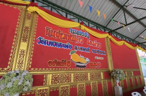อิ่มจนจุกแข่งขันกินข้าวเหนียวมะม่วงชิงเงินรางวัล 1000 บาท ส่งเสริมการท่องเที่ยวท้องถิ่นพร้อมล้วงไหการกุศลในงานประจำปีที่วัดบางกระพ้อ ชูของดี มะม่วงน้ำดอกไม้ อ.บางคล้า จ.ฉะเชิงเทรา