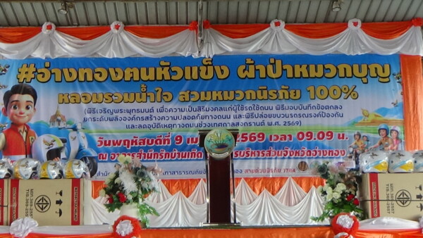 เวลา 09.00 น.วันที่ 9 เมษายน 2569 ที่อาคารสำนึกรักบ้านเกิด องค์การบริหารส่วนจังหวัดอ่างทอง อ.เมืองอ่างทอง จ.อ่างทอง สำนักงานป้องกันและบรรเทาสาธารณภัยจังหวัดอ่างทอง จัดโครงการอ่างทอง “ฅนหัวแข็ง” ผ้าป่าหมวกบุญ หลอมรวมน้ำใจ สวมหมวกนิรภัย 100%