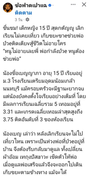 ชื่นชม! “น้องเบญ” ยอดกตัญญูวัย 15 ทิ้งชีวิตวัยรุ่น เก็บขยะขาย-ดูแลพ่อป่วยติดเตียง ผลเรียนดีเยี่ยมเฉลี่ย 3.75