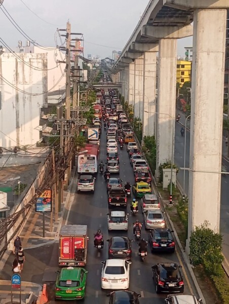 ถนนลาดพร้าว ขาเข้า: เจ้าหน้าที่ต้องปิดช่องจราจรและเหลือเพียง 1 เลน ทำให้การจราจรติดขัดอย่างหนัก ท้ายแถวสะสมยาวถึงหน้าห้างสรรพสินค้าเดอะมอลล์บางกะปิ