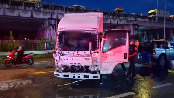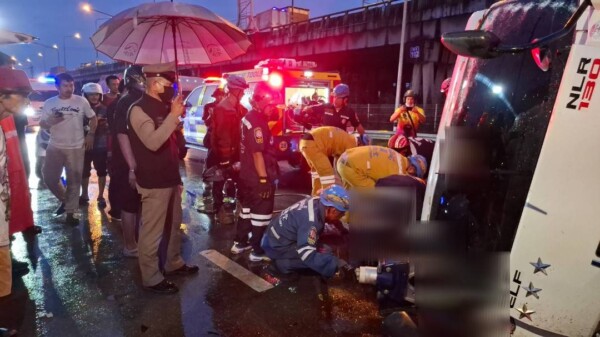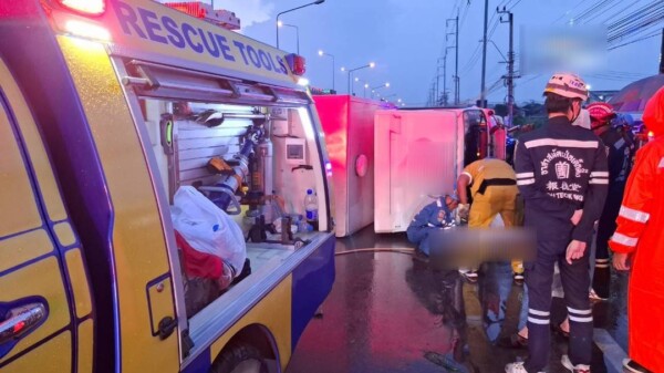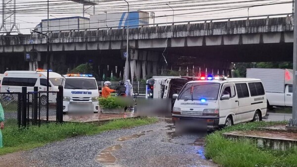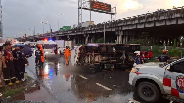 ที่เกิดเหตุอยู่ใกล้กับหน้าร้านอาหารอิ่มเอิบแหนมเมือง (ประชาอุทิศ) แบ่งเป็นถนน 2 เลน เล่นสวนกัน พบรถบรรทุก 4 ล้อ ยี่ห้ออีซูซุ รุ่นเอล์ฟ สีขาว ทะเบียน 3 ฒก 1339 กรุงเทพมหานคร ของบริษัท ขนส่งเอกชนแห่งหนึ่งสภาพพลิกคว่ำตะแคงขวางอยู่กึ่งกลางถนน กันชนหน้ารถหลุด กระจกหน้าแตกร้าว ได้รับความเสียหาย ใต้รถฝั่งคนขับพบศพ นาย พล ( ขอสงวนนามสกุล ) อายุ 46 ปี ชาว จังหวัด สุรินทร์ นอนจมกองเลือด สวมเสื้อยืดสีดำ นุ่งกางเกงยีนส์ขายาว มีบาดแผลศรีษะแตก และเศษสมองกระจายเกลื่อนพื้น เจ้าหน้าที่อาสามมูลนิธิป่อเต็กตึ๊ง จึงต้องใช้อุปกรณ์ตัดถ่างเพื่อนำร่างผู้เสียชีวิตออกมาจากใต้ตัวรถ กระทั่งกู้ร่างออกมาได้สำเร็จ โดยมีตำรวจจราจร สน.ทุ่งครุ คอยอำนวยการจราจร เนื่องจากถนนดังกล่าวเป็นช่วงเวลาที่มีรถสัญจรไปมาจำนวนมาก และมีฝนตกลงมาเป็นระยะ