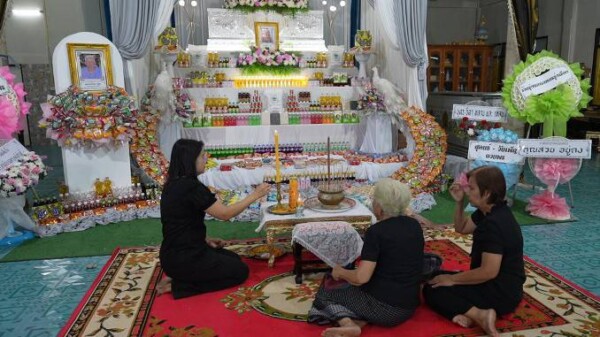 ต่อมา ผู้สื่อข่าวได้เดินทางไปที่ศาลาการเปรียญ วัดบางแตน พบว่าในงานมีพ่อ แม่ พี่น้อง ประชาชน ในพื้นที่ได้เดินทางไปร่วมพิธีสวดอภิธรรมศพเป็นจำนวนมาก และที่บริเวณหน้าโรงศพพบว่า มีการประดับหน้าโรงศพด้วย เครื่องอุปโภคบริโภค อาทิ น้ำมันพืช น้ำปลา อาหารกระป๋อง เป็นจำนวนมาก และที่รูปคุณแม่เสงี่ยม อยู่คง โดยปกติงานศพทั่วไปจะมีการนำดอกไม้มาประดับที่รูปผู้วายชนม์ แต่ที่งานนี้ได้นำมาม่า ขนมยูโร เครื่องปรุงรส ยำยำ รวมทั้งอาหารสำเร็จรูปมาประดับดูสวยงามประทับใจกับผู้มาร่วมงานเป็นอย่างมาก