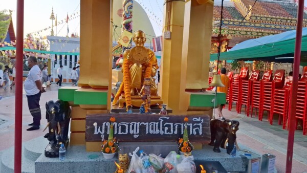 ร้อยโท ธนกฤษฏ์ เอกโยคยะ อายุ 50 ปี รองผู้จัดการกองทุนพัฒนาสื่อปลอดภัยและสร้างสรรค์ กล่าวว่า วันนี้มาเป็นครั้งแรกรู้สึกอิ่มเอิิมใจมากเลยครับ รู้สึกอิ่มบุญที่ได้มาร่วมกิจกรรมในการแจกทานในวันนี้ ส่วนนึงเนี่ยก็ต้องขอบคุณพระยุทธนา ที่เป็นพระสงฆ์ ที่ปฏิบัติดีปฏิบัติชอบและยังเป็นพระนักพัฒนา ตนเองก็เพิ่งทราบตอนไปสวดมนต์ข้ามปีว่าจะมีกิจกรรมในวันนี้ โดยส่วนตัวแล้วตนนับถือหลวงพ่อโอภาสีมานาน สวดมนต์ของหลวงพ่อมานาน แต่ก็ไม่ทราบว่าอยู่ที่ไหน ตนก็เคารพนับถือด้วยใจมาตลอด พอทราบข่าวและชวนมาก็ยินดีมาร่วมกิจกรรม พอมาถึงก็เห็นว่ามีชาวบ้านมารอรับบริจาคเป็นหลักร้อย มีอาสาสมัครมาช่วยกันจัดสรรจัดแจก มีผู้มีจิตศรัทธาที่มาร่วมกิจกรรมนี้และนำสิ่งของจำนวนมากมา ตนก็คิดว่า ต้องมาช่วยกัน ก็ดีใจที่เห็นสังคมไทยที่มีจิตใจอันเป็นกุศล ผู้ที่มีมากหน่อยก็มาเป็นผู้ให้ ผู้มีน้อยหน่อยก็เป็นผู้รับ แต่ตนก็เชื่อว่าเค้าเหล่านั้นก็อยากจะช่วยผู้อื่นต่อไปเช่นกัน ทุกครั้งที่มีการทำบุญแจกทานแบบนี้ ตนเชื่อว่า เทวดา รวมถึงหลวงพ่อโอภาสีท่านเห็นท่านก็อนุโมทนาบุญกับทุกท่านที่มาร่วมกิจกรรมในครั้งนี้ ตนไม่เคยมาพอมาถึงตนก็ไม่เจอใคร พอโทรสอบถามก็มาบริเวณศาลาปู่ พอมาเห็นก็มีชาวบ้านที่มารอเยอะมากเลย มีสิ่งศักดิ์สิทธิ์ทั้งหลายจัดวางไว้ พื้นที่สะอาด เป็นระเบียบ กิจกรรมนี้มีทุกเดือนจะจัดทุกวันอาทิตย์แรกของเดือน ถ้าตนไม่ติดอะไร ตนก็จะมาทุกครั้ง ก็อยากจะเชิญชวน ถ้าท่านใดจะมาร่วมทำบุญก็มาได้เลย ท่านที่พอมีกำลังก็มาร่วมกันทำบุญกันได้ สังคมไทยเป็นสังคมที่เอื้อเฟื้อเผื่อแผ่ครับ