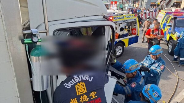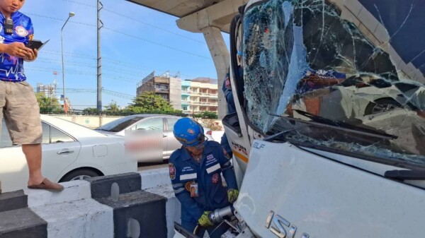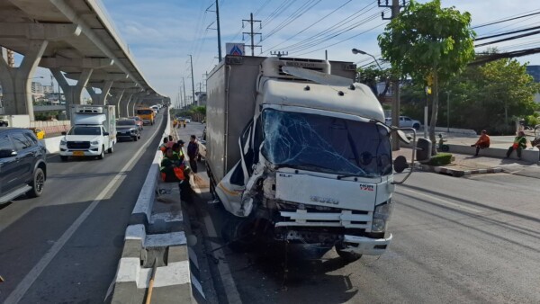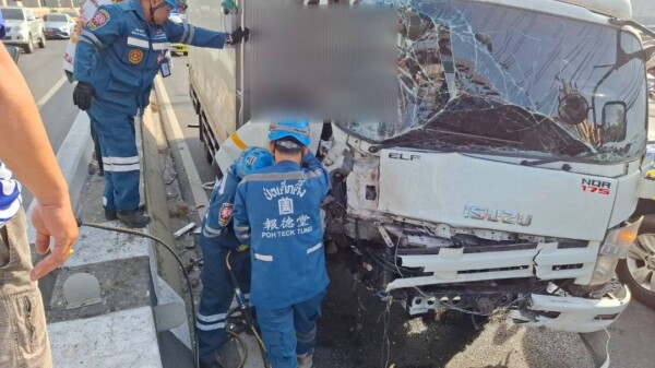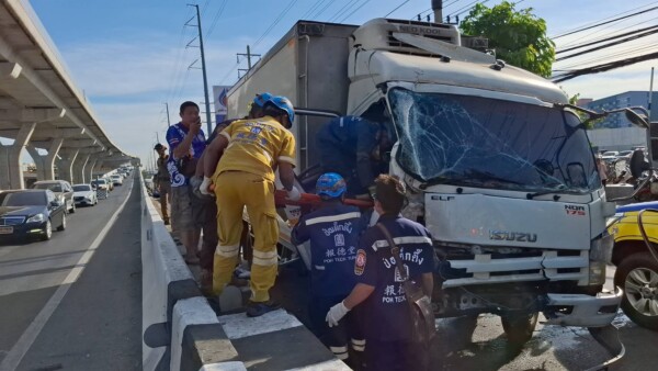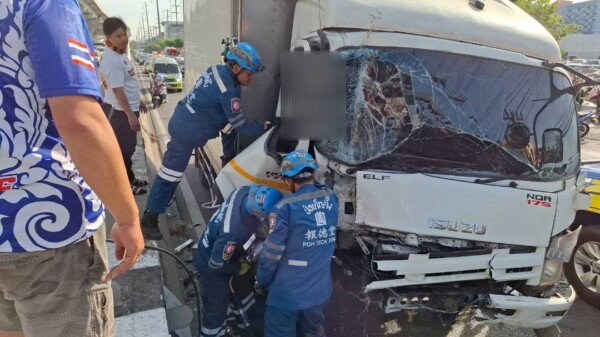 เจ้าหน้าที่ตำรวจ สน.บางมด รับแจ้งมีอุบัติเหตุรถบรรทุกหกล้อตู้ทึบ ชนกับรถกระบะตู้ทึบ แล้วเสียหลักพุ่งไปชนกับแท่นปูนกั้นขอบทางติดภายในได้รับบาดเจ็บ บริเวณปากซอยพระราม 2 ซอย 43 จึงรีบรุดจัดกำลังพร้อมประสานอาสาสมัครมูลนิธิป่อเต็กตึ๊งเร่งรัดตรวจสอบที่เกิดเหตุทันที