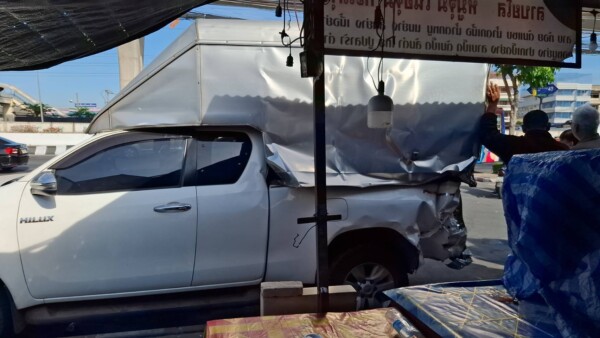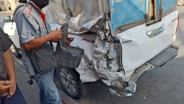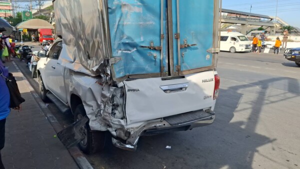 และถัดมาไม่ห่างจากจุดเกิดเหตุพบรถกระบะ ตู้ทึบ ยี่ห้อโตโยต้า สีขาว ทะเบียน 3 ฒก 3360 กรุงเทพมหานคร จอดนิ่งสนิทในสภาพท้ายด้านซ้ายพังเสียหายยับเยิน โดยพบ นาย สุธี ( ขอสงวนนามสกุล ) อายุ 46 ปี คนขับรถกระบะ ยืนรอให้การกับเจ้าหน้าที่ตำรวจอยู่