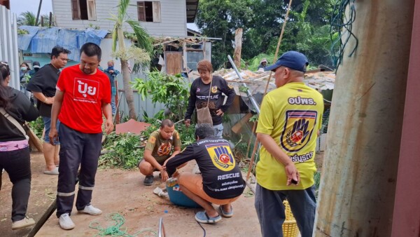 อาสาสมัครป้องกันภัยฝ่ายพลเรือน ( อปพร.เขตราษฎร์บูรณะ ) พร้อมเจ้าหน้าที่ฝ่ายรักษาสิ่งแวดล้อม และชาวบ้าน ช่วยกันเร่งมือตัดต้นนุ่นอายุเกือบ 100 ปี ที่ล้มทับบ้านเรือนประชาชน ภายในชุมชนบ้านสวนราษฎร์บูรณะ ซอย ประชาอุทิศ 14 แขวง บางประกอก เขต ราษฎร์บูรณะ กรุงเทพมหานคร