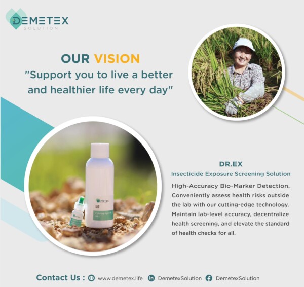 นางสาว คุณนวลพรรณ กิติราช ประธานบริหาร บริษัท ดีมีเทกซ์ โซลูชั่น จำกัด กล่าวว่า “ดีมีเทกซ์ จัดตั้งขึ้นบนแนวคิดที่อยากให้คนธรรมดา มีความสามารถในการจัดการสุขภาพและความสุขในชีวิตได้ ด้วยความมุ่งมั่นนี้ เราจึงผลิตนวัตกรรมที่ช่วยส่งเสิรมการดูและสุขภาพ อนามัย และความปลอดภัยของเกษตรกรและประชาชนทั่วไปได้รับความเสี่ยงจากการสัมผัสสารฆ่าแมลง นำเสนอผ่านเทคโนโลยีชีวภาพที่ใช้ง่ายในราคาที่จับต้องได้ โดยใช้ชุดตรวจคัดกรองสารกําจัดศัตรูพืช ในชื่อแบรนด์ ด็อกเตอร์เอกซ์ (DR.EX) ที่ใช้กลไกของไบโอมาร์คเกอร์ ที่จําเพาะเจาะจงกับสารกําจัดศัตรูพืช