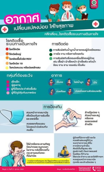 จากข้อมูลของกรมควบคุมโรค กระทรวงสาธารณสุข พบว่าในช่วงฤดูฝนมักพบการระบาดของกลุ่มโรคติดต่อระบบทางเดินหายใจเป็นส่วนใหญ่ โดยเฉพาะโรคโควิด 19 และไข้หวัดใหญ่ ซึ่งโรคระบบทางเดินหายใจส่วนใหญ่เกิดจากการติดเชื้อไวรัสหรือแบคทีเรีย สามารถแพร่กระจายได้ง่ายผ่านทางละอองฝอยจากการไอหรือจาม การสัมผัสกับสิ่งของที่ติดเชื้อ และการสัมผัสใกล้ชิดกับผู้ป่วย ซึ่งข้อมูลจากระบบเฝ้าระวังโรคดิจิทัล (Digital Disease Surveillance: DDS) กองระบาดวิทยา ตั้งแต่วันที่ 1 มกราคม – 22 พฤษภาคม 2568 มีผู้ป่วยไข้หวัดใหญ่ 338,352 ราย อัตราป่วย 521.25 ต่อประชากรแสนคน และมีรายงานผู้เสียชีวิต 44 ราย คิดเป็นอัตราป่วยตาย 0.013 กลุ่มอายุที่พบอัตราป่วยสูงสุด ได้แก่ อายุ 5 – 9 ปี รองลงมาเป็นกลุ่มอายุ 0 – 4 ปี และกลุ่มอายุ 10 – 14 ปี ตามลำดับ โดยข้อมูลจากการเฝ้าระวังเชื้อก่อโรคไข้หวัดใหญ่ พบว่า เชื้อที่เป็นสาเหตุการระบาดส่วนใหญ่เป็นเชื้อไวรัสไข้หวัดใหญ่ชนิด A/H1N1 (2009) ส่วนโรคโควิด 19 ตั้งแต่วันที่ 1 มกราคม – 22 พฤษภาคม 2568 พบผู้ป่วยสะสม 149,190 ราย อัตราป่วย 229.83 ต่อประชากรแสนคน มีรายงานผู้เสียชีวิต 31 ราย อัตราป่วยตาย ร้อยละ 0.02 กลุ่มที่พบอัตราป่วยต่อประชากรแสนคนสูงสุด 3 อันดับแรก ได้แก่ อายุ 0 – 4 ปี (375.44) รองลงมาเป็นกลุ่มอายุ 30 – 39 ปี (346.05) และกลุ่มอายุ 20 – 29 ปี (319.37) ตามลำดับ