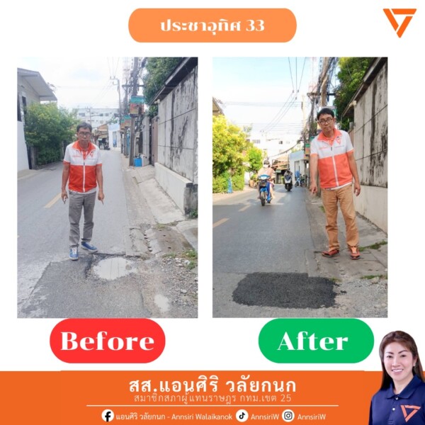 ✅ ประสานซ่อมแซมพื้นผิวถนนบริเวณ ประชาอุทิศ 33 เรียบร้อยแล้ว เพื่อให้พื้นผิวสม่ำเสมอไม่เป็นบ่อก่อให้เกิดน้ำขัง
