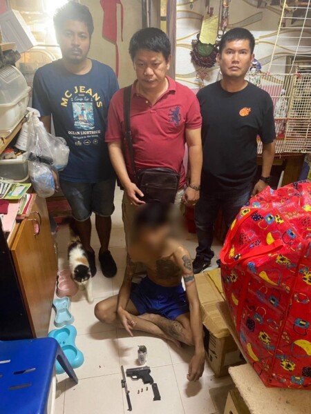 พ.ต.อ.วิชยานนท์ เอกตาแสง ผกก.สน.ท่าข้าม, พ.ต.ท.ธนกร จันรอด รอง ผกก.สส.สน.ท่าข้าม, พ.ต.ท.ไกรฤกษ์ สิทธิโชติ สว.สส.สน.ท่าข้าม และ พ.ต.ต.บัญชา ปิยะศักดิ์สกุล สว.สส.สน.ท่าข้าม สั่งการ ร.ต.อ.นิรันดร์ เมืองใจ รอง สว.สส.สน.ท่าข้าม, ด.ต.พิศิษย์ เย็นเพชร, จ.ส.ต.พิพัฒน์ น้อยเพ็ง, จ.ส.ต.อธิษฐ์ เทียนภู่, ส.ต.อ.ทวีศักดิ์ วีริยากุล, ส.ต.อ.สราวุธ มณีรัตน์ , ส.ต.ท.ชยณัฐ จันรอด และ ส.ต.ท.กันตภณ คำวงค์ศรี ฝ่ายสืบสวน สน.ท่าข้าม จับกุมตัว นาย ธนิน หรือ โฟร์ค ศิลปธรรม อายุ 25 ปี พร้อมของกลาง อาวุธปืน (ไทยประดิษฐ์) ไม่ทราบขนาดจำนวน 1 กระบอก, เครื่องกระสุนปืน ขนาด .32 จำนวน 3 นัด, อาวุธปืน ( ไทยประดิษฐ์ ) ขนาด.32 จำนวน 1 กระบอก และ วัตถุระเบิดแก๊สน้ำตา จำนวน 1 ลูก โดยจับกุมได้ที่ภายในห้องเลขที่ 86/24 โครงการเอื้ออาทร1 ตึก 28 ชั้น 3 แขวง ท่าข้าม เขต บางขุนเทียน กรุงเทพมหานคร