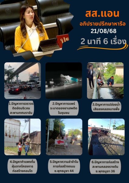 สส.แอน ได้ใช้เวลาปรึกษาหารือในที่ประชุมสภาผู้แทนราษฎร เพื่อสะท้อนเสียงของพี่น้องประชาชนในพื้นที่เขตทุ่งครุและราษฎร์บูรณะ โดยเสนอ 6 ปัญหาเร่งด่วนที่ต้องการให้หน่วยงานที่เกี่ยวข้องเร่งดำเนินการ ดังนี้: