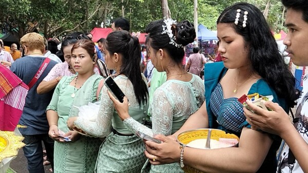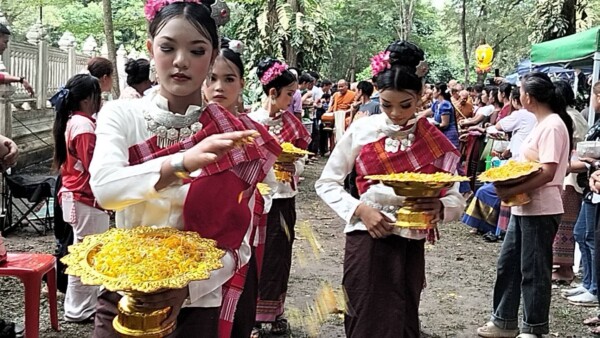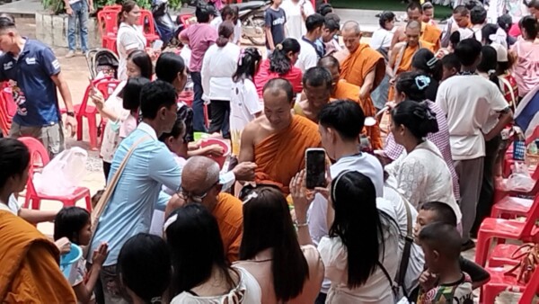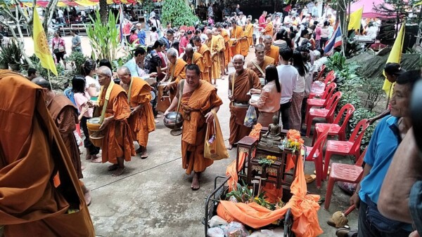 จากนั้นพระสงฆ์ได้เดินรับบิณฑบาตรตักบาตรข้าวสารอาหารแห้งโดยมีขบวนนางฟ้าจากเด็กนักเรียนโรงเรียนบ้านเขาด้วนโปรยดอกไม้นำขบวนโดยมีชาวบ้านมายืนรอใส่บาตร2ข้างทางเป็นแถวยาว