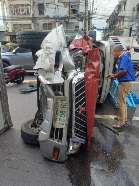 ใกล้กันพบรถกระบะหลังคาสูง ยี่ห้อมิตซูบิชิ สตราด้า สีแดง ทะเบียน กรุงเทพมหานคร สภาพพลิกตะแคงซ้าย ด้านหน้าพังยับเช่นกัน ห่างไปเล็กน้อยพบรถจักรยานยนต์ ยี่ห้อฮอนด้า เวฟ สีแดง ทะเบียน กรุงเทพมหานคร พลิกคว่ำพังยับ คนขับเสียชีวิต
