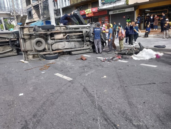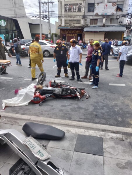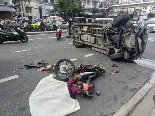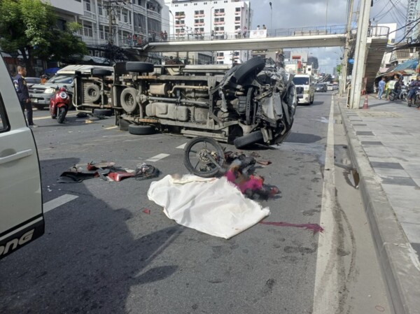กระบะตู้ทึบ เสียหลักข้ามเลน พุ่งเสยจยย.-กระบะ ทำให้สาวขายของชำร่างกระเด็นดับกลางถนน และบาดเจ็บ 7 ราย