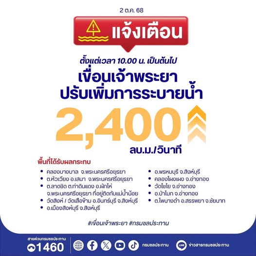 ตั้งแต่เวลา 10.00 น. ของวันนี้(2ต.ค.68)เป็นต้นไป กรมชลประทาน จะทยอยปรับเพิ่มการระบายน้ำผ่านเขื่อนเจ้าพระยา จากอัตรา 2,300 ลบ.ม./วินาที เป็น 2,400 ลบ.ม./วินาที ภายในเวลา 16.00 น. และคงอัตราดังกล่าวต่อเนื่อง เพื่อให้สอดคล้องกับปริมาณน้ำทางตอนบนที่ไหลลงมาสมทบอย่างต่อเนื่อง