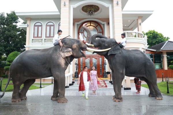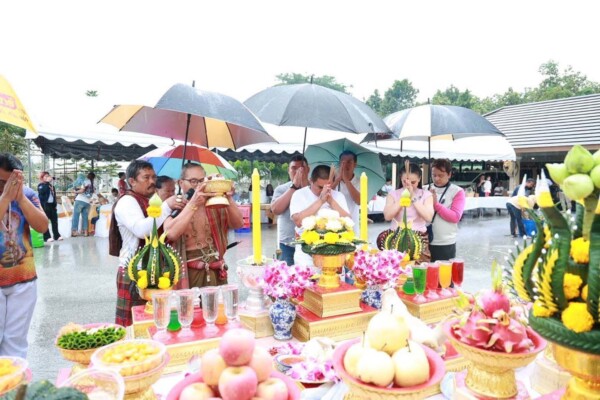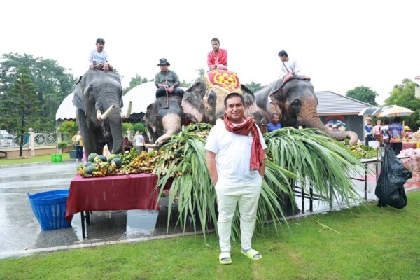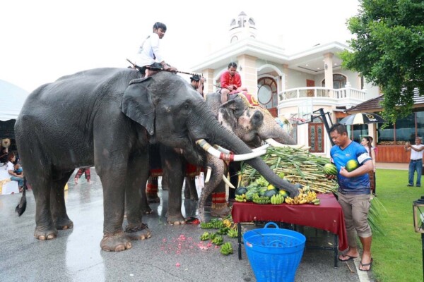 โดยในช่วงเช้าได้นิมนต์พระสงฆ์ 9 รูป เจริญพระพุทธมนต์ พิธีถวายภัตตาหารแด่พระภิกษุสงฆ์ และสังฆทาน จากนั้นได้จัดโต๊ะจีนเลี้ยงอาหารช้าง และได้มอบเงินทุนการศึกษาให้เด็กนักเรียน ที่เรียนดีแต่ยากจนจำนวน 100,000 บาท