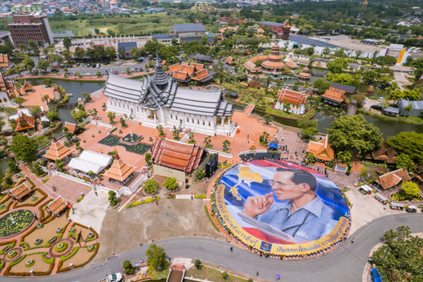 ช่วงสายได้มีการจัดพิธีอันยิ่งใหญ่ คือ การกางพระบรมฉายาลักษณ์ ในหลวงรัชกาลที่ ๙ ที่ใหญ่ที่สุดในโลก ขนาด 1,199 ตารางเมตร ณ ลานสนามไชย เมืองโบราณ โดยคณะนักเรียนเตรียมทหารจำนวน 160 นาย ด้วยความอนุเคราะห์ของกองบัญชาการทหารสูงสุด พร้อมกันนี้ ได้มีการ บรรเลงบทเพลงพระราชนิพนธ์ โดยศิลปินแซกโซโฟนจำนวน 99 คน และการขับร้องของศิลปินและทีมประสานเสียงเยาวชน เพื่อเทิดพระเกียรติและรำลึกถึงพระมหากรุณาธิคุณ นอกจากนี้ ผู้เข้าร่วมงานยังได้เข้าเยี่ยมชม พิพิธภัณฑ์ ‘พระกำลังแผ่นดิน’ หรือ พระสมเด็จจิตรลดา ซึ่งแสดงถึงพระอัจฉริยภาพและพระราชศรัทธาในพระพุทธศาสนาของพระองค์ด้วย