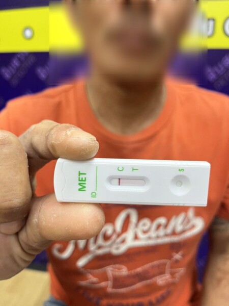 หลังถูกจับกุมตัว นายคิวถูกนำตัวมาสอบปากคำและตรวจปัสสาวะ ซึ่งผลพบว่า “ฉี่ม่วง” เจ้าหน้าที่จึงแจ้งข้อหาเสพยาเสพติดไว้ก่อน