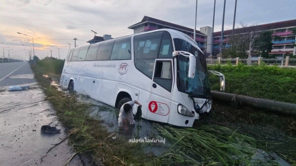 รถบัสรับส่งพนักงาน เสียหลักตกข้างทาง บริเวณ ถนนสุขุมวิท ขาเข้า หน้าโรงเรียนสวนกุหลาบ อ.เมือง จ.สมุทรปราการ มีพนักงานบาดเจ็บ 1 ราย