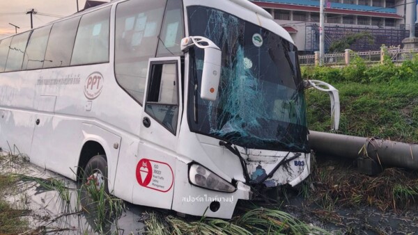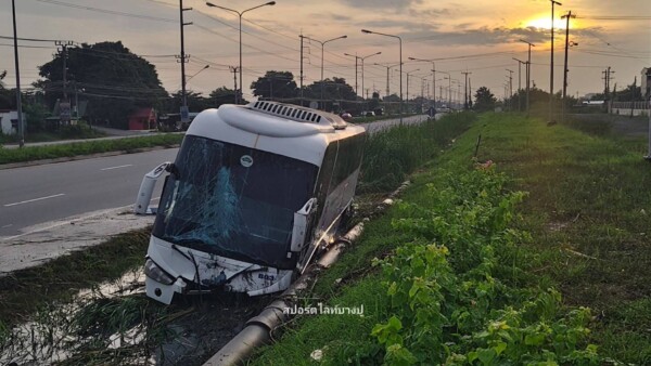 รถบัสรับส่งพนักงาน เสียหลักตกข้างทาง บริเวณ ถนนสุขุมวิท ขาเข้า หน้าโรงเรียนสวนกุหลาบ อ.เมือง จ.สมุทรปราการ มีพนักงานบาดเจ็บ 1 ราย