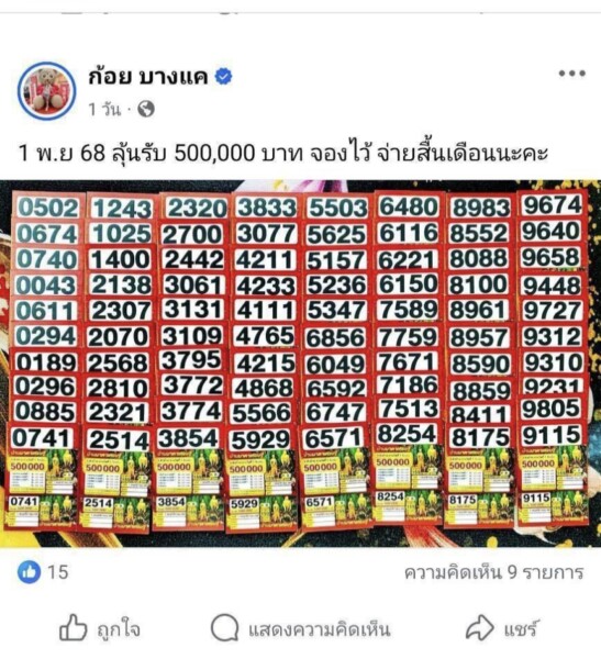 และหวยไทยซึ่งออกทุกวันที่ 1 และ 16 ของเดือน โดยอ้างว่าให้ผลตอบแทนสูง ตัวอย่างเช่น “มาแล้วจ้า 150 ลุ้นรับ 100,000 บาทจ้า จองใต้โพสค่ะ”