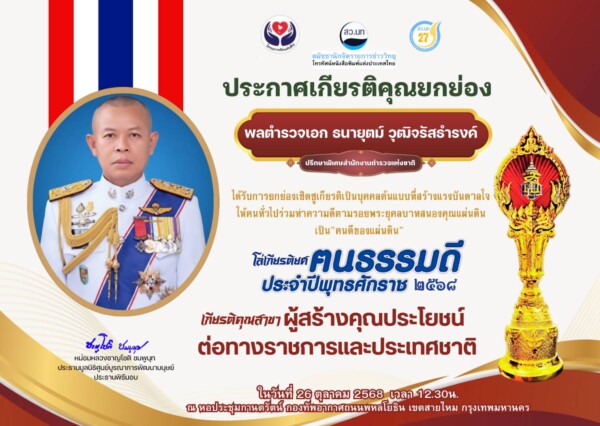 พล.ต.อ.ธนายุตม์ วุฒิจรัสธำรงค์ ได้รับการยกย่องเชิดชูเกียรติให้เป็น”คนธรรมดี” ประจำปีพุทธศักราช 2568