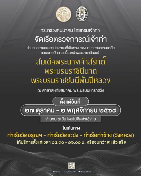 หน้าแรกประชาสัมพันธ์กระทรวงคมนาคม โดยกรมเจ้าท่า จัดเรือตรวจการณ์เจ้าท่า อำนวยความสะดวกประชาชนที่เดินทางมาลงนามถวายความอาลัย และถวายสักการะเบื้องหน้าพระฉายาลักษณ์ สมเด็จพระนางเจ้าสิริกิติ์ พระบรมราชินีนาถ พระบรมราชชนนีพันปีหลวง ณ ศาลาสหทัยสมาคม พระบรมมหาราชวัง