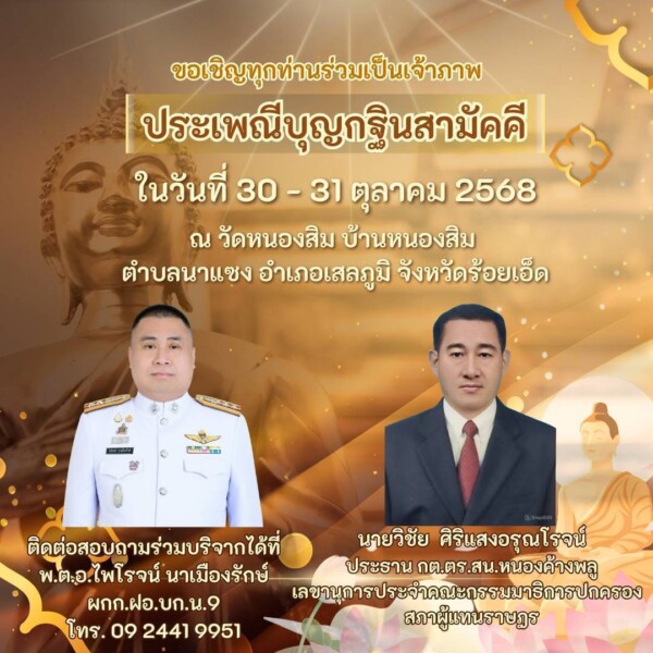 เมื่อเวลา 10:00 น.วันที่ 31 ตุลาคม พ.ศ.2568 ณ วัดหนองสิม บ้านหนองสิม ตำบลนาแซง อำเภอเสลภูมิ จังหวัดร้อยเอ็ด คุณวิชัย ศิริแสงอรุณโรจน์ ประธาน กต.ตร.สน.หนองค้างพลู / เลขานุการ ประจำคณะกรรมมาธิการปกครองสภาผู้แทนราษฎร พร้อมด้วย คุณพุทธินันท์ ธนวัฒนชัยบูรณ์, คุณพรเทพ, คุณองอาจ และคณะกต.ตร.สน.หนองค้างพลู ได้เดินทางร่วมเป็นเจ้าภาพประกอบพิธี ทอดกฐินสามัคคี ร่วมกับ นายนรากร นาเมืองรักษ์ ส.ส.ร้อยเอ็ด เขต 4 และ พ.ต.อ.ไพโรจน์ นาเมืองรักษ์ ผกก.ฝอ.บก.น.9