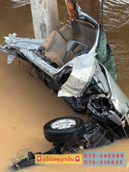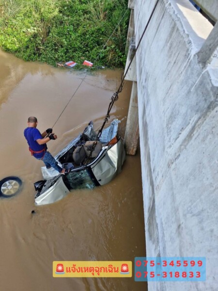 ศูนย์วิทยุมูลนิธิประชาร่วมใจ รับแจ้งเหตุ รถยนต์กระบะเสียหลักชนคอสะพาน ก่อนตกลงไปในน้ำ