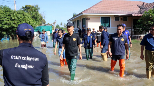 จากนั้น ผู้ว่าราชการจังหวัดสุพรรณบุรี พร้อมคณะ เดินทางต่อไปยังโรงพยาบาลส่งเสริมสุขภาพตำบล (รพ.สต.) หมู่ที่ 2 ตำบลสวนแตง อำเภอเมือง เพื่อมอบถุงยังชีพให้แก่ผู้ประสบอุทกภัย และกลุ่มเปราะบาง จำนวน 6 ครัวเรือน รวมทั้งกล่าวให้กำลังใจประชาชนในพื้นที่ ก่อนจะ เดินทางต่อไปที่ตำบลเจดีย์ อำเภออู่ทอง และเดินเท้าลุยน้ำเข้าเยี่ยมให้กำลังใจและมอบถุงยังชีพให้แก่ผู้ประสบอุทกภัย จำนวน 15 ครัวเรือน โดยมี นายอำเภออู่ทอง รองนายกเทศมนตรีตำบลเจดีย์ ผู้นำท้องที่ ผู้นำท้องถิ่น ร่วมให้การต้อนรับ