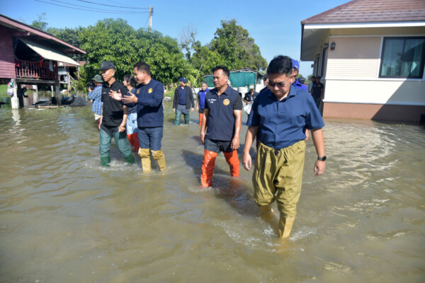 จากนั้น ผู้ว่าราชการจังหวัดสุพรรณบุรี พร้อมคณะ เดินทางต่อไปยังโรงพยาบาลส่งเสริมสุขภาพตำบล (รพ.สต.) หมู่ที่ 2 ตำบลสวนแตง อำเภอเมือง เพื่อมอบถุงยังชีพให้แก่ผู้ประสบอุทกภัย และกลุ่มเปราะบาง จำนวน 6 ครัวเรือน รวมทั้งกล่าวให้กำลังใจประชาชนในพื้นที่ ก่อนจะ เดินทางต่อไปที่ตำบลเจดีย์ อำเภออู่ทอง และเดินเท้าลุยน้ำเข้าเยี่ยมให้กำลังใจและมอบถุงยังชีพให้แก่ผู้ประสบอุทกภัย จำนวน 15 ครัวเรือน โดยมี นายอำเภออู่ทอง รองนายกเทศมนตรีตำบลเจดีย์ ผู้นำท้องที่ ผู้นำท้องถิ่น ร่วมให้การต้อนรับ