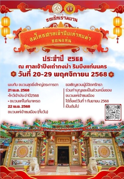 ถนนศรีจันทร์ที่เคยพลุกพล่านด้วยรถยนต์ กลับมามีชีวิตอีกครั้ง ด้วยแสงโคมสีแดง เสียงหัวเราะ และกลิ่นอาหารยามค่ำ บางร้านแขวนป้าย “เฮง เฮง รวย รวย” คู่กับโคมไฟ บางร้านเปิดเพลงจีนคลอเบา ๆ ให้ผู้คนได้หยุดยิ้ม งาน “ปึงเถ่ากงม่า Festival Khon Kaen 2025” จะจัดขึ้นอย่างยิ่งใหญ่ ระหว่างวันที่ 20–29 พฤศจิกายนนี้ ตลอดเส้นทางถนนศรีจันทร์ถึงริมบึงแก่นนคร เพราะนี่ไม่ใช่เพียงเทศกาลแห่งศรัทธาเท่านั้น แต่ยังเป็นเทศกาลของ “แสงแห่งความสัมพันธ์” ที่หลอมหัวใจคนขอนแก่นให้สว่างไสวและอบอุ่นเหมือนบ้านเดียวกันอีกครั้ง