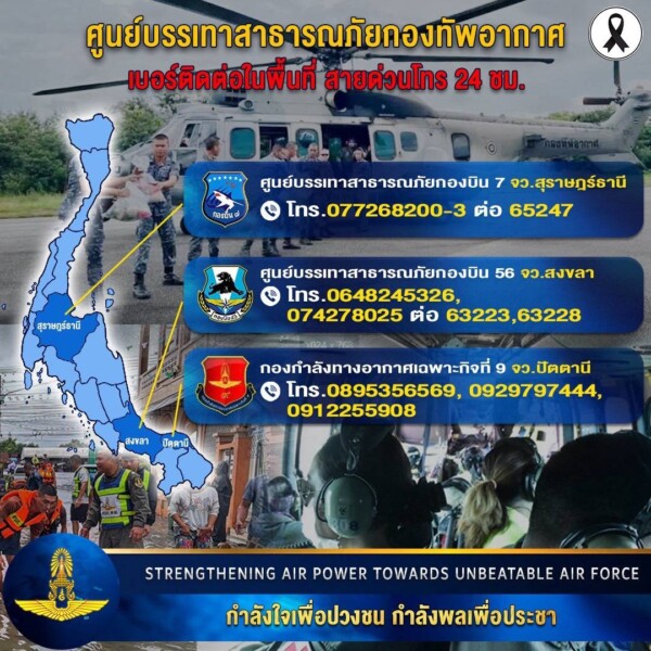 เมื่อวันที่ 26 พฤศจิกายน 2568 กองทัพอากาศได้จัด เครื่องบิน C-130 จำนวน 3 เที่ยวบิน เคลื่อนย้ายกำลังพล ยุทโธปกรณ์ที่จำเป็น และสิ่งของบรรเทาทุกข์ จากกองบิน 6 ดอนเมือง ไปยังกองบิน 56 หาดใหญ่ เพื่อเสริมกำลังเข้าช่วยเหลือพี่น้องประชาชนที่ได้รับผลกระทบจากอุทกภัยในพื้นที่ภาคใต้ โดยมีรายละเอียดดังนี้