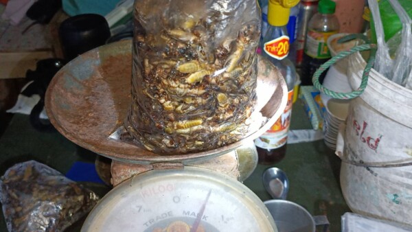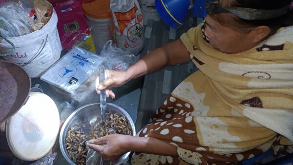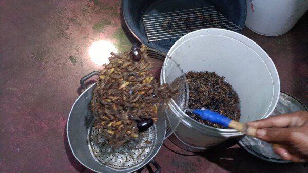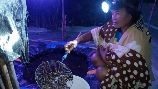 นางปน คำเรียบร้อยชาวบ้านกล่าวว่าได้ทำที่ดักจับแมงกระชอนที่หน้าบ้าน โดยใช้ภูมิปัญญาชาวบ้านง่ายๆขุดหลุมลึกประมาณ 20 เซนติเมตรกว้าง 1 เมตร ลองก้นหลุมด้วยพลาสติกเทน้ำใสลงไปในหลุมพอประมาณ จากนั้นจะใช้เสียงล่อโดยเปิดลำโพงบลูทูธเป็นเสียงแมงกระชอน ใช้ไฟสีม่วงแขวนไว้ด้านบนปากหลุม ข้างล่างจะใช้เป็นไฟสีชมพูล่อถึงจะมา ถ้าไม่เปิดเสียงมันก็จะไม่มาจ้ะ เมื่อแมงกระชอนได้ยินเสียงก็จะพาออกมาตกลงไปในหลุมที่มีน้ำขัง จากนั้นก็รอตักใส่ภาชนะแล้วเอามานึ่ง ถ้าขายเป็นตัวจะขายร้อยละ 70 บาท ซึ่งจะมีพวกนักตกปลามาซื้อ ถ้าเอามานึ่งเพื่อที่จะขายต่อให้กับร้านขายแมลงทอดก็จะมีแม่ค้าพ่อค้ามารับซื้อถึงที่บ้าน ขายกิโลกรัมละ 160 บาท เฉลี่ยคืน 1 ได้แมงกระชอน 2 กิโลกรัม หน้าร้อนจะได้มากกว่า 2 กิโลกรัม ตอนนี้หน้าหนาวจะได้คืนละ 1 กิโลกรัมโดยเปิดเสียงแมงกระชอนไว้ทั้งคืน ก่อน 6 โมงเช้าก็จะช้อนเอาตัวแมงกระชอนใส่ภาชนะไปนึ่งเพื่อรอขายส่งให้ลูกค้าต่อไป