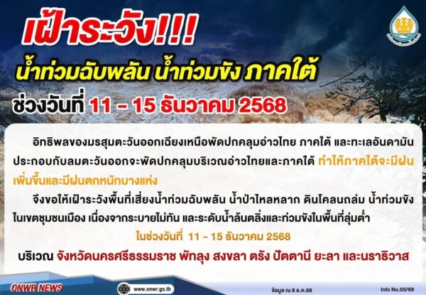 วันนี้ (8 ธันวาคม 2568) ศูนย์ปฏิบัติการน้ำอัจฉริยะ (SWOC) กรมชลประทาน เปิดเผยว่า จากการติดตามคาดการณ์สภาพอากาศร่วมกับกรมอุตุนิยมวิทยา สถาบันสารสนเทศทรัพยากรน้ำ (องค์การมหาชน) และสำนักงานทรัพยากรน้ำแห่งชาติ พบว่า ช่วงวันที่ 11 – 15 ธันวาคม 2568 มรสุมตะวันออกเฉียงเหนือจะพัดปกคลุมอ่าวไทย ภาคใต้ และทะเลอันดามันต่อเนื่อง ส่งผลให้ภาคใต้มีฝนเพิ่มขึ้น โดยเฉพาะจังหวัด นครศรีธรรมราช พัทลุง สงขลา ตรัง ปัตตานี ยะลา และนราธิวาส อาจมีฝนตกหนักบางแห่ง สถานการณ์ดังกล่าวอาจทำให้เกิด น้ำท่วมฉับพลัน น้ำป่าไหลหลาก ดินโคลนถล่ม รวมถึงน้ำท่วมขังในเขตชุมชนเมืองจากการระบายน้ำไม่ทัน และระดับน้ำล้นตลิ่งในพื้นที่ลุ่มต่ำได้