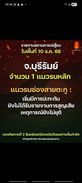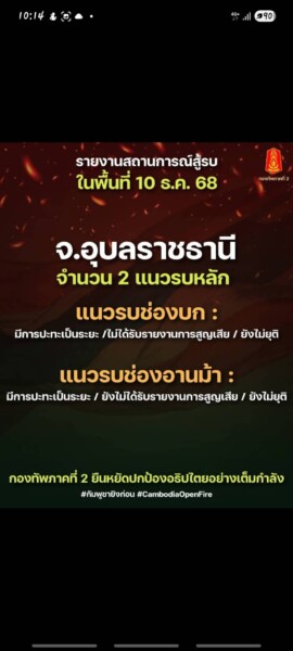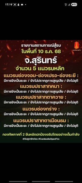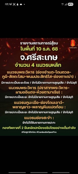 ทภ.2 รายงานสถานการณ์สู้รบในพื้นที่ 10 ธ.ค. 68 ตั้งแต่เวลา 05.20 ถึงเวลานี้