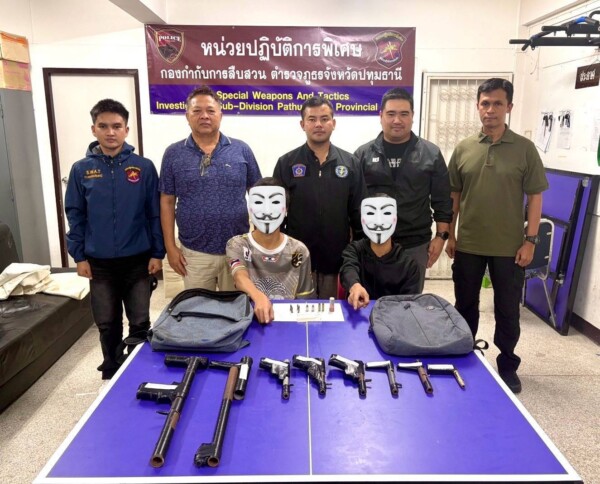 วันนี้ 15 ธันวาคม 2568 พล.ต.ต.พีรพล โชติกเสถียร ผบก.ภ.จว. ปทุมธานี พ.ต.อ.หฤษฎ์ คำจุมพล ผกก..สส.ภ.จว.ปทุมธานี พ.ต.ท.ธนุส วิสุทธาภรณ์รองผกก..สส.ภ.จว.ปทุมธานี ร่วมกันจับกุมนายเปา (นามสมมติ) นายพี (นามสมมติ) ทั้งสองรายอายุ15ปี พร้อมด้วยของกลางอาวุธปืนไทยประดิษฐ์ จำนวน 8 กระบอก (หลายขนาด)กระสุนปืนลูกซอง เบอร์ 12 จำนวน 1 นัด กระสุนปืนขนาด .38 จำนวน 2 นัด กระสุนปืนขนาด 9 มม. จำนวน 2 นัด กระสุนปืนขนาด .22 จำนวน 6 นัด กระเป๋าเป้สะพายหลังสีเทา จำนวน 2 ใบ โดยจับกุมได้ที่เพิงพักไม่มีเลขที่ ภายในซอยรังสิต–นครนายก 25 ต.ประชาธิปัตย์ อ.ธัญบุรี จ.ปทุมธานี