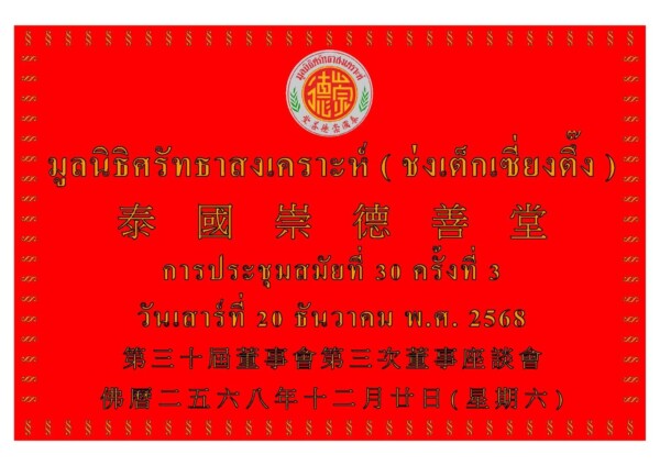 เมื่อเวลา 10:30 น.วันที่ 20 ธันวาคม พ.ศ.2568 ณ ชั้น 2 ห้องนพวงศ์ 1 โรงแรมเดอะทวินทาวเวอร์ ถนนพระราม 6 เขตปทุมวัน กรุงเทพฯ คณะผู้บริหารมูลนิธิ ศรัทธาสงเคราะห์ ช่งเต็กเซี่ยงตึ๊ง นำโดย คุณบวรทัต พิชยธนกิจ 董事長李楚雄先生 เป็นประธานในที่ประชุมฯ พร้อมด้วย ประธานกิตติมศักดิ์ผู้ทรงเกียรติถาวร/ ที่ปรึกษา คุณประพันธ์ โลหวิบูลย์กิจ ,永遠名譽董事長兼參議李振欽先生 ประธานเกียรติคุณผู้ทรงเกียรติถาวร คุณบุญชัย ลิขิตธนวงศ์ 永遠榮董事長李岳發先生 รองประธานฯ คุณมนตรี โลหวิบูลย์กิจและภรรยา 李振來先生王妙嬋伉儷 คุณสว่าง ตั้งพงศ์ 陳仁傑先生 คุณซื่อเฮี้ยง เล้า 劉賜雄先生 รองประธานฯควบเหรัญญิก คุณพิพัฒน์ กนกนิตย์อนันต์ 文國華先生 รองประธานฯ คุณวิวัฒน์ โลหวิบูลย์กิจ,李劍鵬先生 คุณสิริรัตน์ แซ่ลิ้ม 李林金枝女士 กรรมการบริหารฯ คุณสุรชัย โลหวิบูลย์กิจ 李國臣先生 คุณศิริวัฒน์ โลหวิบูลย์กิจ 李劍榮先生 คุณถาวร ลีรุ่งมณี 李永根先生,กรรมการ คุณธนัท หฤษฎีชวลิต 李楚堅先生 และแขกผู้มีเกียรติ เข้าร่วมในที่ประชุมฯ