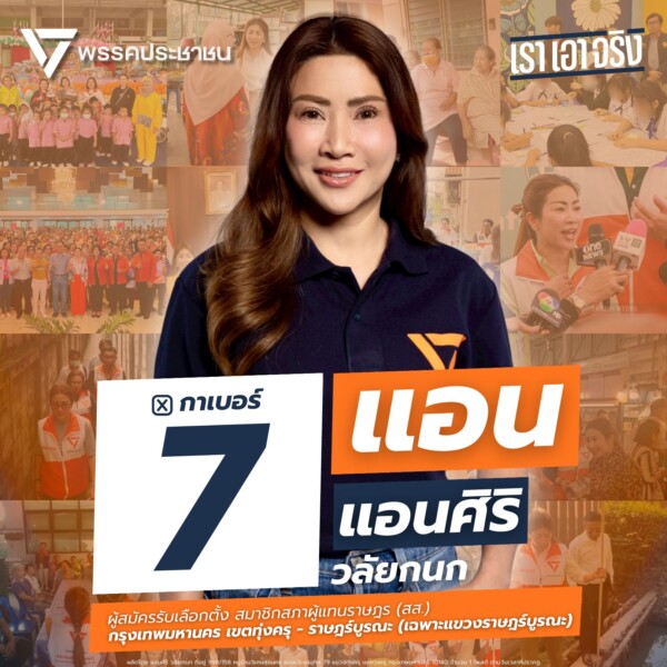 แอนศิริ วลัยกนก ผู้สมัครหมายเลข 7 พรรคประชาชน ขออาสากลับมาสานต่อภารกิจอีกครั้ง เพื่อพื้นที่ทุ่งครุ–ราษฎร์บูรณะ พื้นที่ที่เธอผูกพัน เข้าใจ และทุ่มเทหัวใจให้มาโดยตลอด เพราะสำหรับเธอ การเลือกตั้งไม่ใช่เพียงการเลือกคนหน้าใหม่ แต่คือการเลือกคนที่รู้จักพื้นที่ เข้าใจปัญหา และพร้อมยืนเคียงข้างประชาชนในทุกสถานการณ์