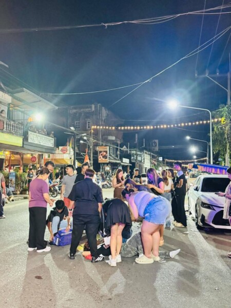 ในที่เกิดเหตุ พบผู้บาดเจ็บจำนวนหลายราย นอนบาดเจ็บอยู่บนพื้นถนน และบนพื้นฟุตบาท เจ้าหน้าที่เร่งเข้าปฐมพยาบาล และนำตัวส่ง ตึกอุบัติเหตุ รพ.ระนองทันที ผู้บาดเจ็บทั้งหมด 7 ราย หญิง 5 ชาย 2
