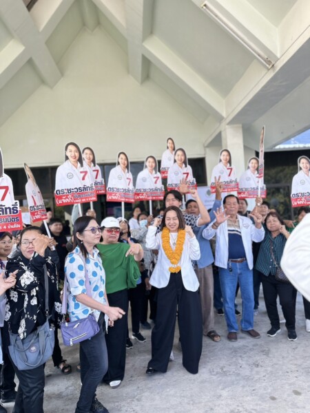 ภายหลังเสร็จสิ้นขั้นตอนการสมัคร บริเวณทางออกของโรงยิมเนเซี่ยมเต็มไปด้วยกลุ่มประชาชนและกองเชียร์ที่มารอให้กำลังใจอย่างเนืองแน่น เสียงเชียร์และรอยยิ้มสะท้อนบรรยากาศที่อบอุ่นและเป็นกันเอง หลายคนได้นำพวงมาลัยและช่อดอกไม้มามอบให้ เพื่อแสดงความยินดีและส่งพลังใจให้กับอดีต ส.ส.หญิงที่ยังคงยืนหยัดอยู่ในเส้นทางการเมืองอย่างมั่นคง
