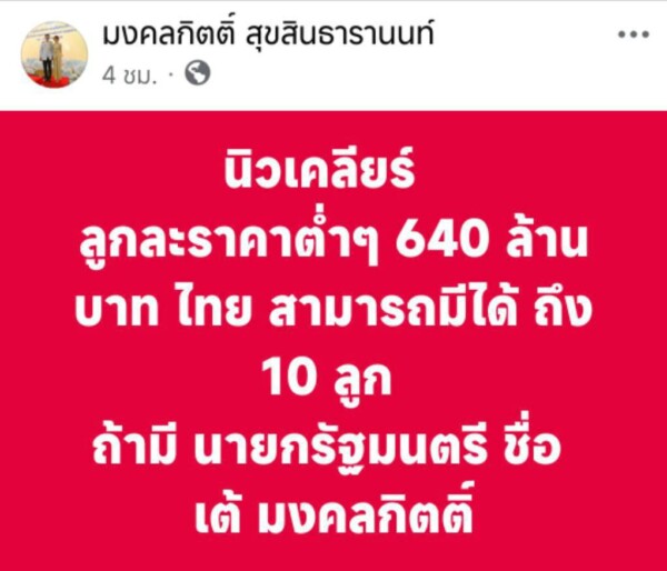วันที่ 5 มกราคม 2569 นายมงคลกิตติ์ สุขสินธารานนท์ หรือเต้ 007 ได้ให้สัมภาษณ์สื่อมวลชน เกี่ยวกับประเด็นเนื้อหาการโพสต์โดยระบุว่า “นิวเคลียร์ ลูกละราคาต่ำๆ 640 ล้านบาท ไทย สามารถมีได้ ถึง 10 ลูก ถ้ามี นายกรัฐมนตรี ชื่อ เต้ มงคลกิตติ์” โดยเต้ ได้กล่าวว่า จะสังเกตได้ว่าแต่ละประเทศมีกองทัพที่เข้มแข็ง มีเศรษฐกิจที่เข้มแข็ง อย่างสหรัฐอเมริกา มีเงินตราเป็นของตัวเอง มีธนาคารโลก มีหลายๆหลังที่เข้มแข็ง แต่ก็กระจายกำลังกองทัพไปทั่วโลกไปทั่วมหาสมุทร เหมือนกับกองทัพโลก เพราะฉะนั้นเศรษฐกิจสหรัฐอเมริกามันถูกกับความมั่นคง และสหรัฐอเมริกามีหัวรบนิวเคลียร์อยู่ 5,000 กว่าลูก รัสเซียมี 6,000 กว่าลูก และประเทศปากีสถานประเทศอังกฤษก็มีกันหมด และประเทศที่ใกล้ไทยก็คือเกาหลีเหนือมีอยู่ประมาณ 30 ลูก ในขณะที่นิวเคลียร์เนี่ยเขามีกันไว้เขาไม่ได้มีไว้เพื่อประหารกัน เขาเอามีไว้เพื่อคานอำนาจกลับประเทศมหาอำนาจ ไม่ให้รังแกเรา ซื้อเอาไว้แต่ไม่ได้ใช้ นิวเคลียร์เคยใช้ล่าสุดถล่มที่ฮิโรชิม่านาสากิ หลังสงครามโลกครั้งที่ 2 ญี่ปุ่นแพ้สหรัฐอเมริกา ครั้งเดียวนอกนั้นจะเป็นการทดสอบใช้นิวเคลียร์แบบลูกไม่ใหญ่มากในมหาสมุทร เพราะฉะนั้นนิวเคลียร์จะมีลูกขนาดลูกเล็กยันลูกใหญ่ ลูกเล็กลูกละ 20 ล้านดอลลาร์ หรือ 640 ล้านบาท ลูกใหญ่ลูก 270 ล้านดอลลาร์ ลูกใหญ่กับลูกเล็กต่างกันตรงไหน ต่างกันตรงรัศมีในการทำลายล้าง ลูกเล็กอาจจะ 1 ตำบลหายไป ลูกกลางๆอาจจะอำเภอหายไป ลูกใหญ่ๆอาจจะทั้งจังหวัดหายไป เป็นต้น เพราะประเทศมหาอำนาจเขานิวเคลียร์เอาไว้ คานอำนาจทางเศรษฐกิจ เหมือนกับว่าเราไปค้าขายกับประเทศนี้ เขาเห็นเรามีนิวเคลียร์เขาก็จ่ายเงินเรา เขาเห็นกองทัพไทยเข้มแข็งมีนิวเคลียร์ เขาก็อยากที่จะเป็นมิตรด้วย เพราะว่าไว้โอกาสภายภาคหน้าประเทศไทยจะช่วยเหลือเขาได้ ทางการทางทหารเขาก็มาขายกับเรา มันก็จะเรียกว่าการคาญอำนาจทางเศรษฐกิจ ไม่ว่าจะเป็นความมั่นคง และความมั่นคงทางเศรษฐกิจและความมั่นคงทางกองทัพ มันจะไปพร้อมๆกัน ถ้ามีเศรษฐกิจที่ใหญ่แต่ไม่มีกองทัพที่เข้มแข็งมันก็จะไปร่วมกันไม่ได้ เพราะฉะนั้นประเทศที่ใหญ่ๆกองทัพเข้มแข็งหมด เพราะฉะนั้นแนวคิดที่ได้มีแนวคิดไว้เป็นแนวคิดของพรรคทางเลือกใหม่ ถ้าหากได้พบมงคลกิตถ้าเป็นนายกฯ แน่นอนอย่างน้อย 10 ลูก เพราะว่า 6,400 ล้าน 10 ลูก ไม่เยอะเกินไป เพราะว่าเรือซีเกทลำหนึ่ง 20,000 ล้าน แพงกว่านิวเคลียร์ 10 ลูกอีก เพราะฉะนั้นเราซื้อเอาไว้เพราะคานอำนาจทางเศรษฐกิจ เพื่อเอาไว้ในอนาคตใครมาข่มขู่เรา วันใดวันหนึ่งโดนัลด์ทรั