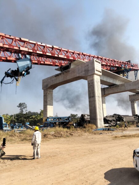 โครงสร้างเครนหัก: แรงกระแทกจากการหลุดของฐานรองรับ ส่งผลให้โครงเหล็กส่วนหลักหักลงมาพาดกับโครงสร้างสะพาน