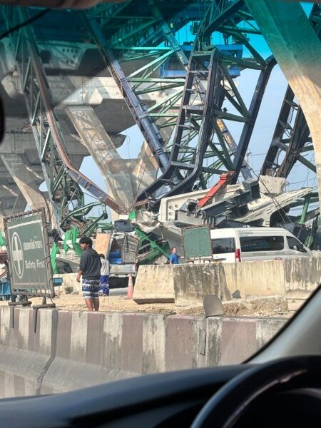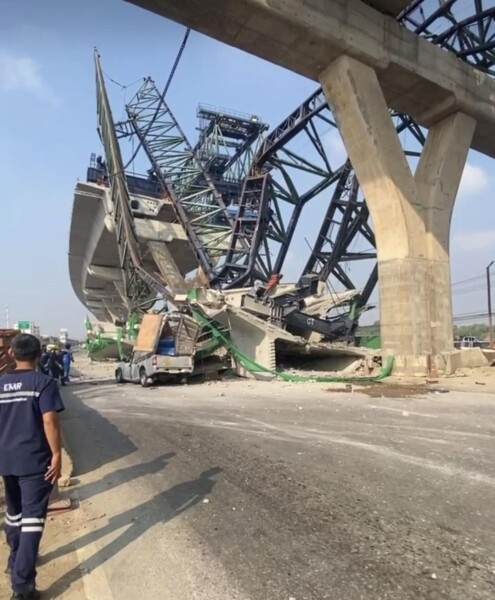 ผลกระทบ: เครนขนาดใหญ่ล้มทับพื้นผิวจราจรในช่องทางด่วน ส่งผลให้รถไม่สามารถสัญจรผ่านได้ในจุดดังกล่าว