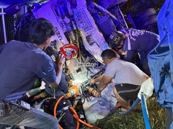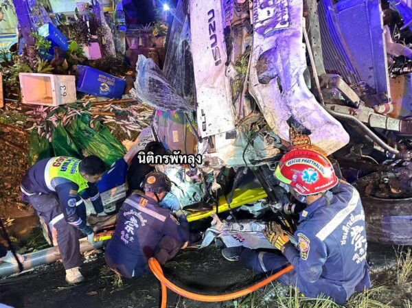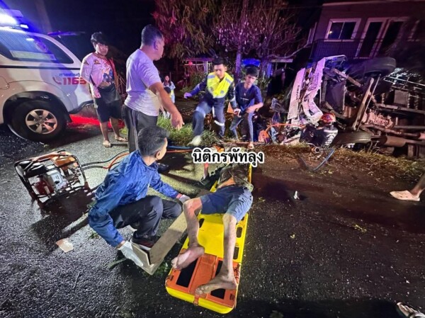 คนขับคือ นายปิยะ สิทธิ์ประสงค์ อายุ 53 ปี ได้รับบาดเจ็บสาหัส ถูกซากรถอัดติด เจ้าหน้าที่กู้ภัยใช้อุปกรณ์ตัด-ถ่างช่วยเหลือก่อนนำส่งโรงพยาบาลพัทลุง ขณะเดียวกันปลาทูจำนวนมากเทกระจาดเกลื่อนพื้นถนน