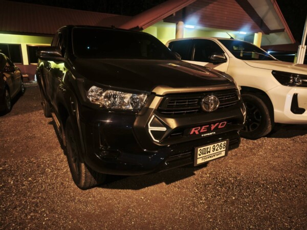 ตรวจยึดของกลางเป็นรถยนต์กระบะยี่ห้อโตโยต้า รุ่นรีโว่ จำนวน 2 คัน แผ่นป้ายทะเบียนปลอม 2 คู่ โทรศัพท์มือถือ 4 เครื่อง และกุญแจรถยนต์ 2 ดอก