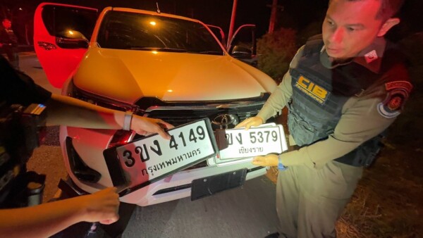 จากการตรวจสอบพบว่าแผ่นป้ายทะเบียนที่ติดอยู่เป็นป้ายปลอม ไม่มีตราสัญลักษณ์กรมการขนส่งทางบกและไม่มีรหัสควบคุมแผ่นป้าย สอดคล้องกับข้อมูลการสืบสวนที่พบว่าขบวนการดังกล่าวมีการเตรียมป้ายทะเบียนปลอมไว้เปลี่ยนระหว่างการเดินทาง เพื่อตบตาเจ้าหน้าที่และหลีกเลี่ยงการตรวจสอบ