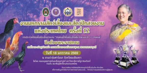 วันอาทิตย์ที่ 18 มกราคม 2569 เวลาประมาณ 09.30 น. นายคเณศวร เกษอินทร์ นายอำเภอคลองเขื่อน ร่วมงาน มหกรรมสัตว์ปีกและสัตว์เลี้ยงสวยงาม เฉลิมพระเกียรติ ครั้งที่ 12